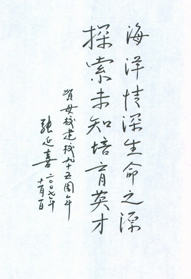 日前,出席我校95周年校庆庆典的原农业部副部长、我校1959届捕捞专业校友张延喜同志欣然为母校题词:“海洋情深生命之源,探索未知培育英才”,祝贺母校建校九十五周年。