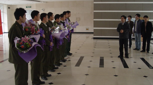 12月6日上午,我校2005年参军的9名大学生光荣退伍返校。校党委副书记、副校长黄晞建、校长助理、教务处处长吴建农及相关部门、学院领导在科技大楼大厅举行隆重仪式热烈欢迎我校第二批大学生士兵回到学校。欢迎仪式开始前,与会的职能处室领导及学院领导向退伍学生敬献了鲜花,黄副书记在欢迎仪式上致欢迎辞,并在校长助理吴建农宣读颁发9名退伍大学生人民奖学金的决定后为所有退伍学生颁发了人民奖学金证书和奖学金,随后所有领导与退伍大学生合影留念。