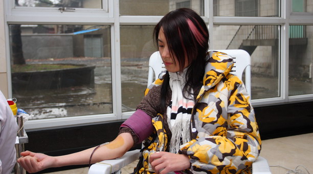 鲜红的血液缓缓地注入采血袋中,师生们无私献出的不仅仅是救人于水火的生命之液,更包含了广大师生关爱他人的热忱之心和回报社会的拳拳之情!