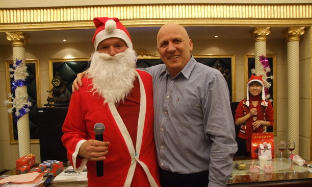 晚会上,中外方教师相互举杯祝福,畅谈工作和未来,大家一边唱歌,一边跳舞,一边做游戏,完全陶醉在节日的气氛中,当晚会进行到中场时,突然有一位身着红衣、头带红帽、长着白须的圣诞老人缓缓走进大厅,边走边向大家喊:“Merry Christmas!”,他来给大家送圣诞礼物了,每发一次礼物他都要说一次“Merry Christmas”、合一次影,俨然就是Santa Clause来到人间,大家仔细辨别才知道,原来这位韵味十足的圣诞老人就是来自美国的外教Michael。