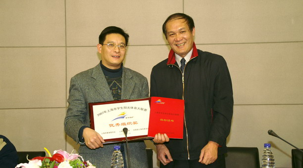 颁奖典礼中,程裕东副校长代表我校接受了上海市阳光体育活动最高奖项---优秀组织奖奖牌,55名阳光体育活动学生先进个人;11个学生优秀运动队、学生社团社团;13名优秀指导教师、23名优秀教练员、6个教工先进社团受到表彰。