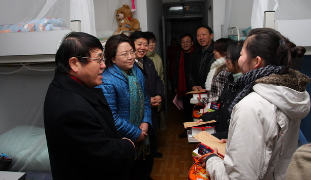在随后由校党委书记叶骏主持的座谈会上,潘迎捷校长汇报了我校安置寒假在校学生的工作情况。潘校长说,学校是一个汇聚了31个省(市)、有20多个民族的学生大家庭,每年寒暑假都有相当一部分学生因为学习、生活、路途偏远等原因驻守学校。今年我校留校的学生达300多人,学校非常重视留校学生的生活、学习、勤工助学工作,为了让同学们在学校过一个平安、祥和、快乐的春节,几年来,学校坚持实行“六个一”工程——每周看望学生一次;提供一个助学岗位;发放一张电话卡;发放一个大礼包;发放一张电影票;吃好一顿年夜饭。在精神方面和物质方面都给予关心和爱护。
