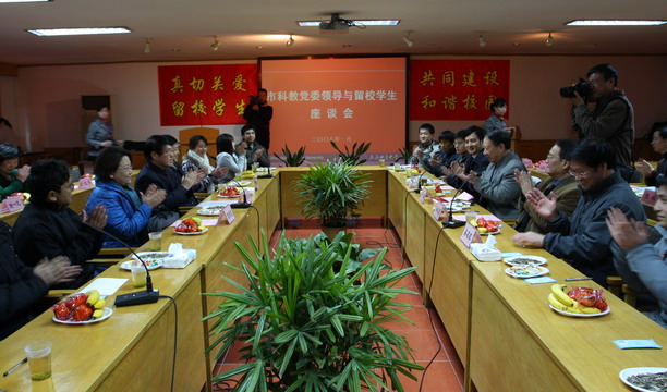 座谈会上,17名留校学生代表对市科教党委、教委领导的关怀和关爱表示衷心的谢意,也向领导汇报和畅谈了留在学校的学习、生活的感受。其中博士生代表、第十届全国“挑战杯”银奖获得者韩志同学在座谈中说:“在学校过年是温暖而又幸福的,学校领导每年都会给大家送来不一样的惊喜,我已经在学校过了三次春节了,我感觉在学校过春节很好,而且一年比一年好,家里也很放心!”