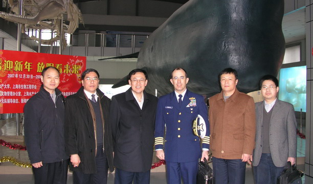农业部渔政指挥中心彭晓华副主任(左三)一行在抹香鲸标本前合影