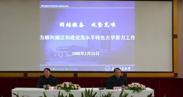 潘迎捷校长向全体教职工作了题为《团结振奋,攻坚克难,为顺利搬迁和建设高水平特色大学努力工作》的报告。报告主要分两部分:一是回顾2007年学校工作;二是部署2008年的主要工作。潘校长指出,2007年是学校丰收的一年,喜庆的一年,也是学校工作取得优异成绩的一年。 在2007年,学校教学质量不断提高,科研水平不断提升,队伍建设不断加强,招生就业任务圆满完成,素质教育不断推进,新校区建设和搬迁准备工作进展顺利,后勤保障工作不断推进,学校财力不断增强,广大职工收入不断增长,精神文明建设卓有成效。潘校长指出,虽然学校在2007年的工作中取得了不少成绩,但学校发展与高水平特色大学的要求还有很大差距,在2008年的工作中,要把解决这些问题作为学校工作的主要任务,作为内涵建设的主要抓手,全力推进学校的各项工作。