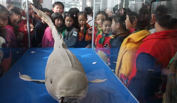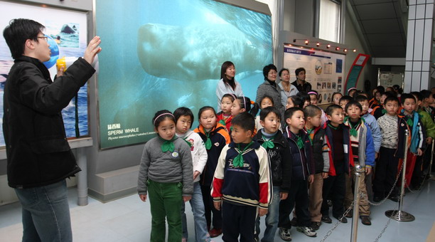 “哇,这鲸鱼真大!”“鲸鱼的牙齿是真的吗?”“它是怎么呼吸的啊?”,今天下午,来自杨浦区水丰路小学120位小学生一走进我校鲸鱼馆,看见硕大的抹香鲸标本连连发出赞叹声。在8位老师带领下,小朋友们先后参观了我校鲸馆和水生生物科技馆,上了一堂生动的科普课。