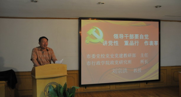 在两个小时的报告里,刘宗洪教授从中央开展这次“讲党性、重品行、作表率”主题教育活动的重要性和对领导干部的要求两个方面展开论述。刘教授在报告中指出,此次主题教育活动是新形势下的一次重要党内思想教育活动,是全面落实科学发展观的重大举措,是推进社会和谐的重要途径。在新的历史条件下,作为执政党,要在长期执政的条件下实现党的宗旨,在监督体制不完善的情况下有严明的纪律;作为党的干部,在社会思潮多元化的情况要有坚定的政治立场,在社会转型时期要坚持清正廉明,在各种诱惑中要有高尚的生活情趣,在全面建设小康社会过程中提高自身的素质能力。刘教授对两个问题的阐述深入浅出,大量真实案例、流行语的运用增添了报告的诙谐生动,使在座听众在轻松的笑声中感悟此次主题教育活动的深意与真谛。