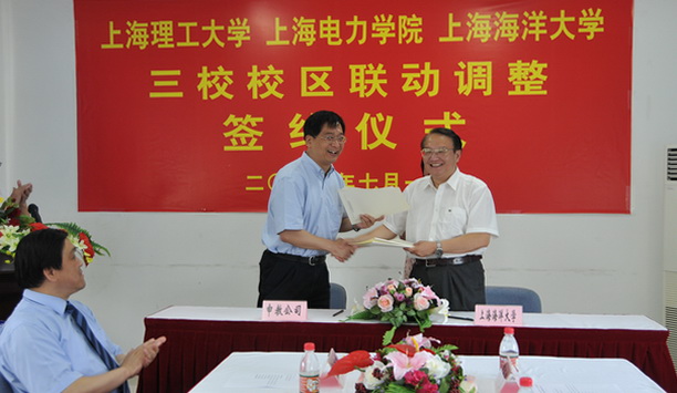 7月1日,我校和上海理工大学、上海电力学院三校校区联动调整签约仪式在我校临港新校区建设指挥部会议室举行,市科教党委书记李宣海,市科教党委副书记、市教委主任薛明扬,市科教党委副书记、市教委副主任、申教公司总经理莫负春,市教委副主任李骏修,市科教党委副巡视员佘国平、副秘书长谢一龙等出席签约仪式。仪式由市教委发展规划处处长马宪国主持。