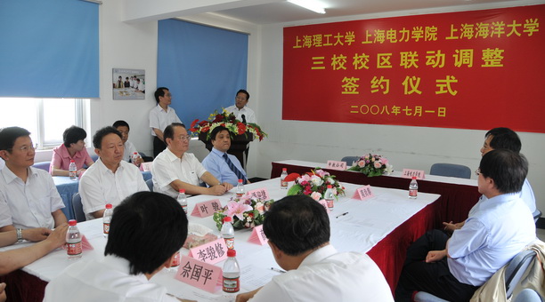 仪式上,校长潘迎捷、上海理工大学校长许晓明、上海电力学院院长曹家麟分别代表学校与申教公司总经理莫负春签订协议,并发表讲话。潘校长指出,学校整体搬迁到临港新城,既是学校发展史上的大事,也是上海市教育系统的大事,学校将克服一切困难,确保新校区建设顺利推进,确保顺利搬迁。市教委主任薛明扬发表了讲话。薛主任指出,在建党87周年华诞之际,能够见证三校联动,感到非常高兴。薛主任指出,三个高校广大师生顾全大局,相互支持、相互理解、相互配合,推动了三校有机联动,协议的签署,标志着三校校区联动进入了关键时期。薛主任希望三所高校以高度的责任感抓好联动工作,确保相关移交工作顺利完成。薛主任指出,上海高校结构布局调整已经进入尾声,已开始进入内涵建设发展的新阶段,上海市教委作为服务型政府和责任政府,将积极支持三校联动,推进三所高校更好更快地发展。