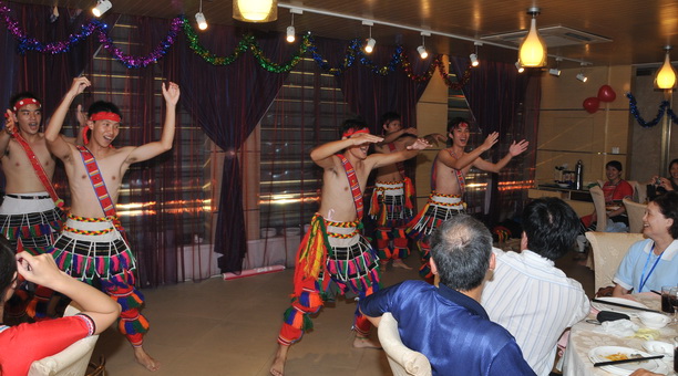 晚上我校设宴款待台湾师生,我校大学生艺术团在欢迎晚宴上为台湾朋友献上了精彩的节目,台湾的同学也,表演了极具民族风情的舞蹈等节目,博得全场一片掌声,我校全体接待师生的深情合唱中宴会达到高潮。