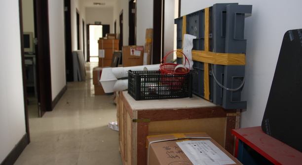 由于搬迁物品较多,部分设备仪器被整齐地堆放于走道中。