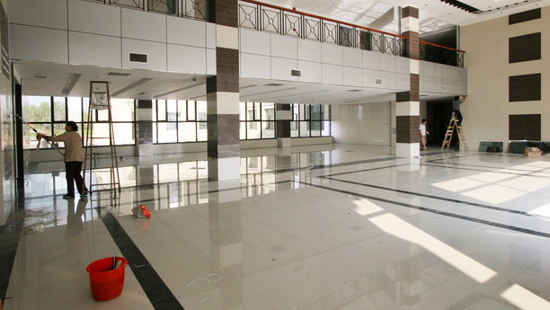 物业正对行政楼作日常保洁。