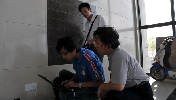 现教中心教师正指导工作人员维修网络。