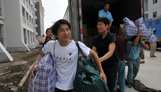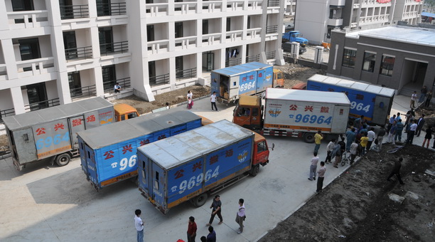 为确保搬迁工作圆满顺利,一大批感人至深的场面不断涌现。部分志愿者早上天刚亮就从临港校区出发前往学海路校区帮助老师指导工人师傅装车、记录并统计行李搬动情况。当志愿者们看到工人师傅背负上百斤的行李吃力的行走、上楼时,看到工人师傅身上的衣服屡屡被汗水湿透仍坚持工作时,都被深深的打动了,他们不时主动的为工人们递上香烟、饮水和一些小点心。天黑了,经过一天的劳作,搬场工人师傅已经疲惫,在卸载最后两车的行李时,行动已经非常缓慢,这时几位志愿者主动爬上搬场车帮助卸载行李,在场师生一起加入了搬运的队伍……;学生处为了保证工作结束较晚的同学能够洗上热水澡,特意购置热水壶发给辅导员为学生烧热水;学院多数教师也放弃了假日休息,坚守在现场担任协调指导工作。