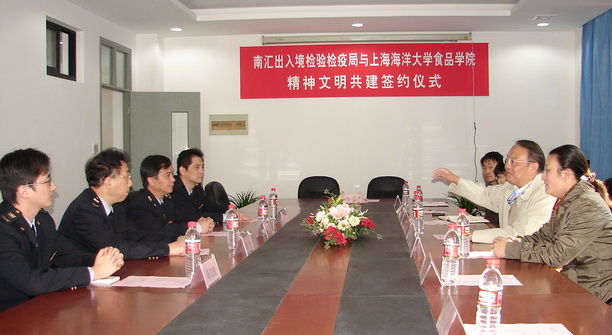 韩世明局长在讲话中谈到,与上海海洋大学食品学院开展精神文明共建是学习落实科学发展观的重要举措。南汇局作为中直单位,在出入境检验检疫过程中具有丰富的实践经验,食品学院在科学研究、教育培训等方面有着深厚的基础。希望双方能够在食品加工、检验检疫、方法标准等方面加强合作,获得学院的智力支持,促进业务水平的提升。韩局长同时表示,要努力推进双方多方位合作,在共建中为学院的成果落地和转化提供平台。