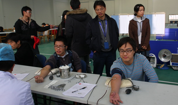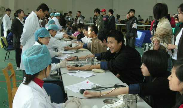 初冬时节,阵阵寒意,但是在海大校园却洋溢着浓浓的暖意。从12月2日到4日,2008年度无偿献血活动在我校体育馆进行,这是我校搬迁至临港校区的第一次大规模献血。在学校领导的高度重视下,在后勤服务中心、校团委及各学院等部门的精心组织下,各学院积极动员、同学踊跃报名,全校报名人数达到1968名,实际鲜血人数达到1505人,占我校学生总人数的11.7%,平均十个同学中就有一个献血,创我校献血人数的最高纪录。