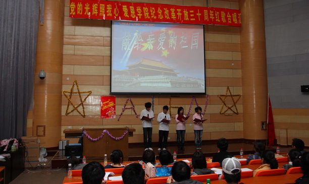12月3日晚, 以“REMEMBER AND RECALL 党的光辉照我心”为主题的爱恩学院纪念改革开放三十周年班级红歌合唱汇演在第一教学楼1117室举行。