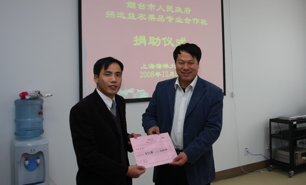 12月8日,烟台市人民政府驻上海办事处信息处张怡平处长以及山东招远益农果品专业合作社王枚生社长一行5人专程来到我校,向经济管理学院一名家庭经济困难学生捐助现金壹万元。据悉此善款是山东省烟台市人民政府在上海举行了烟台苹果品牌推介会上,该企业的一箱50年苹果树上生长的8个苹果拍买所得。企业认为向家庭贫困大学生伸出我们的援助友爱之手,帮助他们圆大学梦想,是传承中华民族的传统美德,也是体现企业的社会责任。现场举行了简单而隆重的捐赠仪式,学生处罗汝坤副处长代表校方接受捐赠,并向企业颁发了捐赠证书,职能部门及学院相关人员参加了仪式。