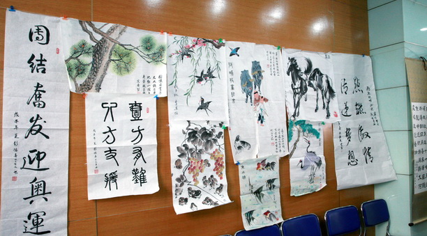 会场同时展示的我校退(离)休教师书画作品。