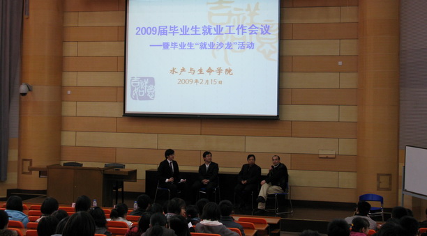 2009年2月15日下午,水产与生命学院2009届毕业生工作会议暨就业沙龙活动在1117顺利举行,活动邀请了我校招毕办主任张宗恩、97级校友——千城万店亿次客总裁蔡文卫先生和02级校友——第一批参加上海市“三支一扶”计划并正式入职青浦区水产技术推广站苏明先生作为嘉宾。
