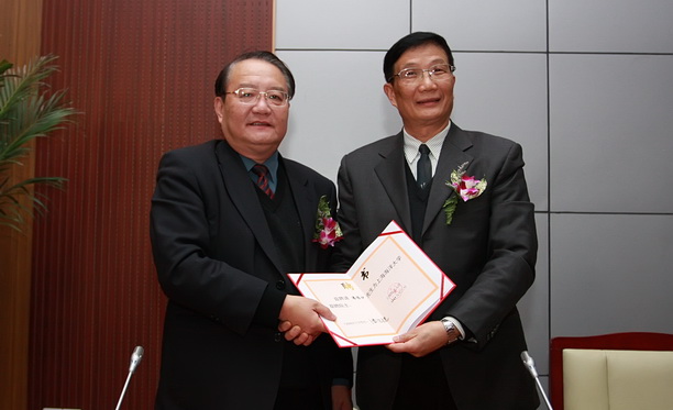 潘迎捷校长向潘德炉院士(右)颁发聘书。