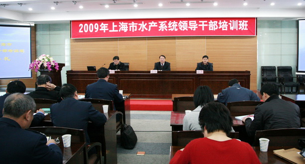 2009年上海市水产系统领导干部培训班于3月23至26日在我校军工路校区培训中心举行。来自全市各区(县)农委水产办主任,渔政站站长、书记,水产技术推广站站长、书记以及市属水产系统中层以上干部约80余名学员参加了本次培训班,潘迎捷校长、上海市水产办梁伟泉主任、成教学院成长生院长出席培训班开班典礼。