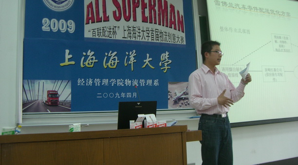 2009年5月20日 “ALL SUPERMAN——百联配送杯”上海海洋大学首届物流创意大赛决赛在我校拉开帷幕。本次大赛由上海物流学会主办、上海海洋大学经济管理学院物流管理系承办,大赛得到了百联配送有限公司、上海耀华建材系统集成供应中心、上海华联配送实业有限公司的大力支持,上海华联配送公司为本次大赛赞助5000元。赛前,潘迎捷校长、程裕东副校长会见了前来出席大赛活动的上海市物流学会会长李厚圭一行,双方协商进一步合作事项。