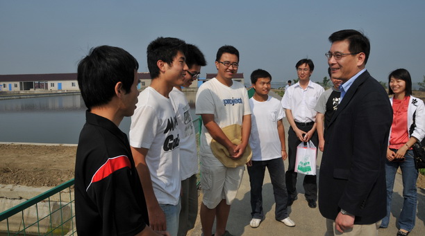 在养殖塘边,程裕东副校长与实习学生亲切交谈。