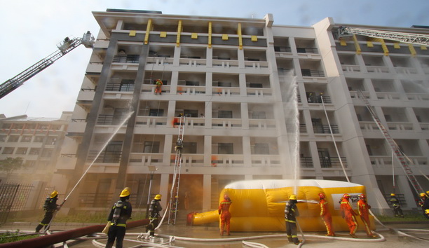 为加强消防知识在学校的宣传和普及,使广大学生了解和提高发生火灾后的逃生技巧,学会自救和互救,做到临危不乱,有序、迅速地按照消防逃生路线安全疏散,避免因火灾而发生人身伤亡事故。6月16日下午,我校在学生公寓第五小区41号和42号楼成功举行新校区首次消防演习。校长潘迎捷、副校长封金章、南汇公安分局副局长严衍辉、南汇消防支队支队长季华、政委沈渭勇、学校相关部门负责人、各学院党委副书记和学生代表共1000余人参加、观摩了演习。消防演习活动仪式由校保卫处姜新耀处长主持,南汇消防支队邹冲参谋长和校保卫处张旭副处长任演习现场总指挥。