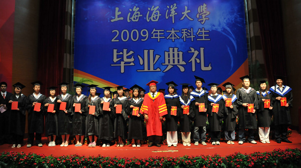 典礼在雄壮的国歌声中拉开帷幕。海洋科学学院副院长杨红、工程学院副院长王永鼎分别宣读了两学院毕业生名单。根据《上海海洋大学本科学分制学籍管理条例》,2009年海洋学院和工程学院共有313名学生在学校规定年限内,修完教育教学计划规定的内容,德、智、体达到毕业要求,获得毕业证书。在欢快的乐曲声中,校院领导向各位毕业生颁发证书,并合影留念。校长助理、教务处处长吴建农宣读了市优秀毕业生表彰决定,学生处副处长罗汝坤、招生与就业办副主任朱克勇宣读了校优秀毕业生表彰决定,黄硕琳副校长和海洋科学学院院长许柳雄、工程学院院长王世明为18位市优秀毕业生和33位校优秀毕业生一一颁发证书,祝贺他们取得优异成绩。