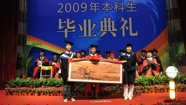 即将离别母校,广大毕业生们恋恋不舍。为答谢母校的培养,毕业生代表向学院赠送了纪念品,海洋科学学院党委书记许四杰、工程学院党委书记王明华代表学院接受纪念品,并合影留念。