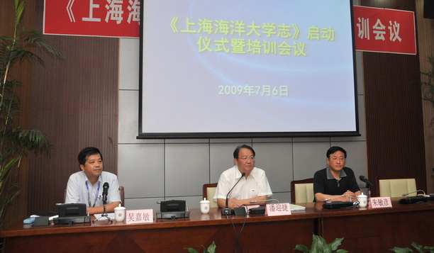 7月6日,《上海海洋大学志》编纂工作启动仪式暨培训会议举行,上海地方志办公室副主任朱敏彦、区县联络指导处副处长王继杰出席会议。校志主编、校长潘迎捷做启动动员,常务副主编、校志编纂办公室主任、党委副书记吴嘉敏主持会议。