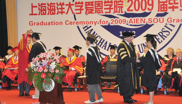 学位颁发仪式由塔斯马尼亚大学校长Daryl Le Grew教授主持进行,在爱恩学院副院长胡应平和副院长王基组的宣读下,300多名爱恩学子一一走过舞台。灯光下,学士服的金红色披肩熠熠生辉,学子们脸上洋溢着喜悦和自豪,在与塔斯马尼亚大学校务委员会主席Mr.Damian John Bugg的行礼握手中,在上海海洋大学校长潘迎捷教授的微笑颔首中,学子们四年来的努力得到肯定,但更多的是校长们对毕业生们未来的希冀。上海海洋大学和塔斯马尼亚大学两张学士学位证书,见证了莘莘学子勤奋学习和两校合作办学的艰辛历程,是一个梦想的实现和另一段旅程的起点。