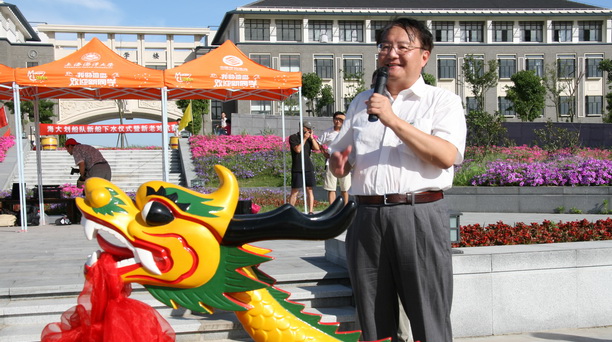 此次新购进的龙舟身长11米、型宽9米、型深0.54米,全重180千克,为全玻璃钢结构,标准乘员12人,龙头朝天伸展,龙尾高翘,红、蓝两船穿行于夏日的海大校园构成一幅流动的风景。会上,校体育运动委员会主任、副校长程裕东教授发表了重要讲话,鼓励划船队队员再接再厉,为学校争得更多的荣誉。龙舟队队员集体宣誓后,划船队队员进行了新老队员对抗赛,引得到会嘉宾和同学们的阵阵掌声。最后由老队员组成的蓝舟技高一筹,赢得了对抗赛的胜利。