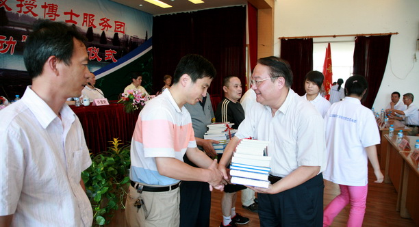 启动仪式上,潘迎捷校长向金山区、嘉定区、松江区、青浦区、奉贤区和崇明县水产技术推广站的负责同志赠送了我校编撰出版的渔业科技入户指导书籍。参加启动仪式的领导和专家还向上海海洋大学教授博士服务团八个分团的团长授旗。