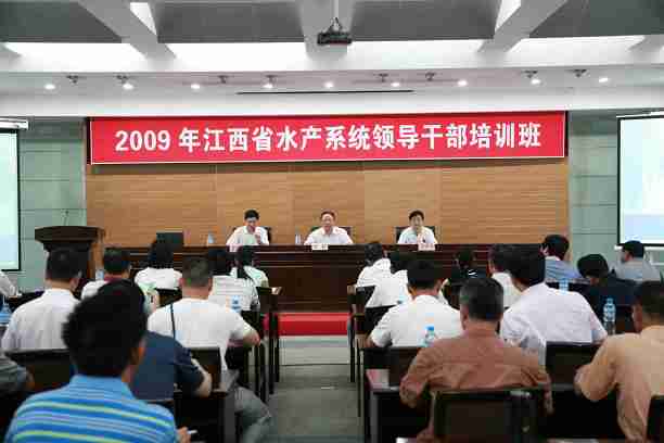 江西省水产系统领导干部培训班于2009年7月10日至7月17日在我校军工路校区培训中心举行。江西省水产系导干部和企业经营管理人员共82人参加了本次培训。我校党委书记叶骏教授、江西省水产局官少飞局长出席了开班典礼,副校长程裕东教授、江西省水产局于向阳副局长参加结业典礼,成人教育学院成长生院长主持了开班、结业典礼。