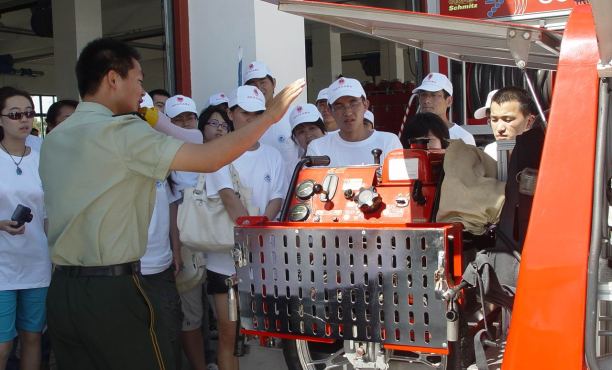 近日我校大学生一行近四十人在临港消防中队的大力支持下参加了“消防夏令营一日游”活动。夏令营由保卫处马永明老师带队,大学生们首先来到了上海市消防博物馆,了解了上海消防的发展历程,从古老的人工压水车,到以蒸汽为动力的消防车;从完全靠人工扑火,到运用高科技力量帮助完成救火;从完全受外国人管制,到赢得消防的自主权。不到两个小时的参观,大家学到了消防安全的基本知识,以及在火灾发生后如何自救和救人的基本方法。下午大学生到临港消防中队参观体验消防官兵生活。临港消防中队是一个训练精良、装备齐全的消防队伍,负责临港地区200多平方公里的消防安全。消防战士给大学生表演了登高、翻墙、迅速出警的表演,从下楼、着装、上车到赶往火场的整个过程不超过5分钟。临港消防中队队长告诉大学生,新的《消防法》的诞生,扩大了消防警的职能,现在消防警不仅仅只是救火,在自然灾害和其他事故现场消防官兵都会第一时间到达现场营救。
