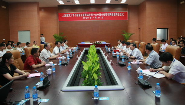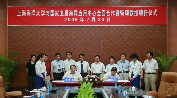 7月30日上午,我校与国家卫星海洋应用中心全面合作协议签订暨兼职教授聘任仪式在校图文信息中心102室举行。国家卫星海洋应用中心蒋兴伟主任、林明森副总工程师、邹斌研究员,上海海洋大学校长潘迎捷教授、副校长黄硕琳教授,我校特聘教授恽才兴,校办主任张敏教授、科技处处长李柏林教授,海洋科学学院院长许柳雄教授、副院长杨红教授和陈新军教授,海洋科学学院系主任、教研室主任,海洋信息工程系全体教师,以及在校博士和硕士研究生,本科生等80余人参加了签订仪式。仪式由黄硕琳副校长主持。