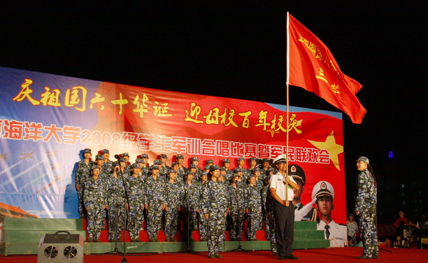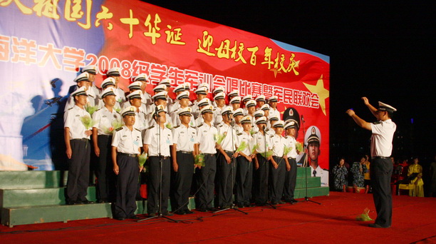 时值祖国六十华诞,海大百年校庆之际,军训的学员们用他们最嘹亮的歌声,来宣扬他们宏伟的志向。这是学员们共同的心声,也是海大人奋斗的目标。
