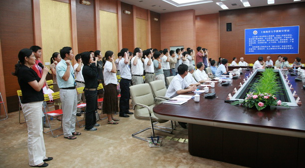 “我将遵循上海海洋大学‘勤朴忠实’的校训精神,热爱学校,团结协作,为上海海洋大学的发展作出更大的贡献。”9月10日,在图文中心102会议室隆重举行的庆祝第25个教师节座谈会上,今年刚入校的50位新教师庄严宣誓,立志做一名光荣的人民教师。出席会议的全体在校校领导,离退休老领导,各民主党派主委,离退休教师代表,各学院、各职能部门领导,09年度校先进教师代表,学生代表百余人共同见证了他们的誓言。校党委副书记、副校长黄晞建主持座谈会。