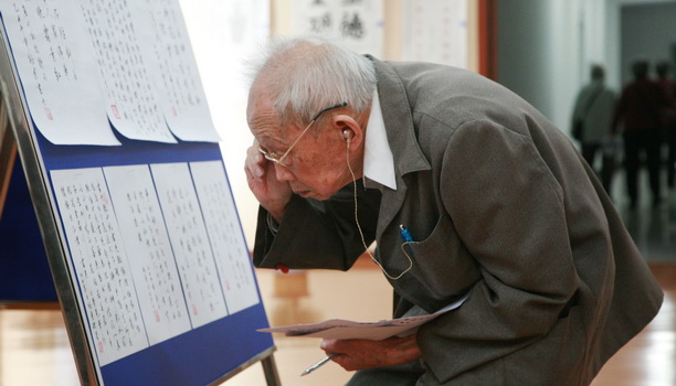 九十七岁高龄的骆肇尧老先生正专注地审视参展作品