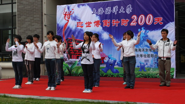 宣传世博精神,弘扬世博文化,10月13日下午,上海海洋大学“迎世博倒计时200天”主题活动在周周演舞台隆重举行。校党委书记叶骏应邀出席,申港街道团工委代表以及各学院老师和学生也参与了本次活动。