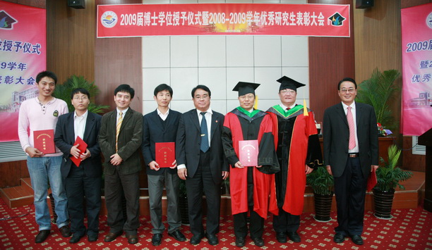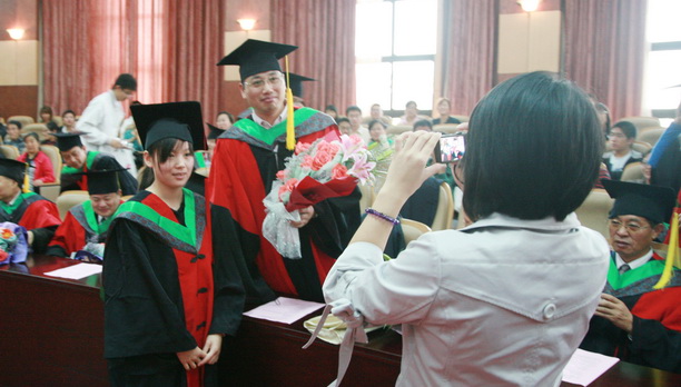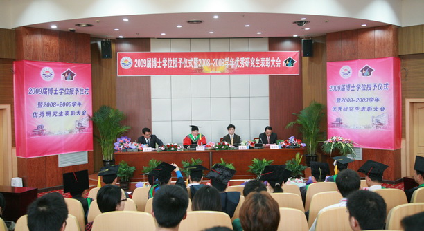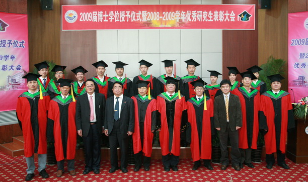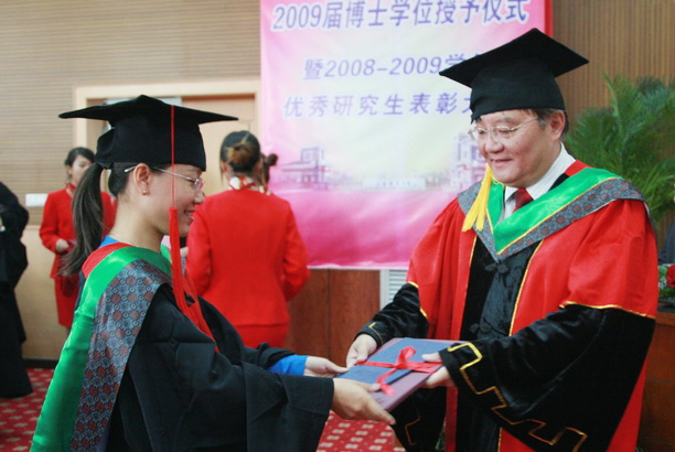 首先由校学位评定委员会副主席、副校长黄硕琳教授宣布授予博士学位人员名单。2009年我校共毕业博士研究生13人,获得学位13人。其中获得农学博士学位12人,获得工学博士学位1人。校学位评定委员会主席、校长潘迎捷教授向各位博士学位获得者颁发证书、授予学位。之后,毕业博士研究生怀着真挚的心情向辛勤培育和悉心指导他们的导师敬献鲜花并合影留念,以表达他们这三年来对导师的感激之情。