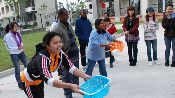 为丰富留学生们的课余文化生活,日前国际文化交流学院举办了一场生动活泼的趣味体育比赛。来自俄罗斯、韩国、越南、泰国、坦桑尼亚、孟加拉国、蒙古、日本、尼泊尔等9个国家的50名留学生欢聚在一起,互相竞争、互相加油,度过了一个难忘的下午。