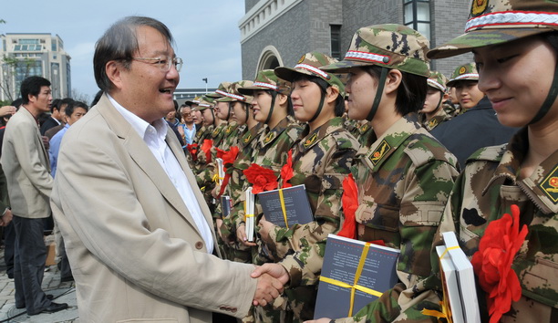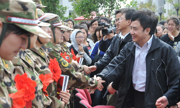 潘迎捷校长致欢送词时指出,大学生接受祖国挑选,投身火热军营这是一件值得高兴、自豪、骄傲的大事、喜事,他代表全校师生员工对43名入伍女大学生表示热烈的祝贺,对积极支持、送子女参军的家长表示感谢,并要求广大学生向参军学生学习。同时勉励入伍学生尽快转变角色,在部队努力学习、刻苦训练,充分展现海大人“勤朴忠实”的作风,对自己要高标准、严要求,为世博安保作出应有的贡献,用自己的聪明、才智和良好的作风,在世博园区树立出上海海洋大学一道亮丽的风景线。