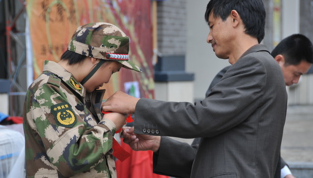 为爱女佩戴上大红花,一人当兵全家光荣