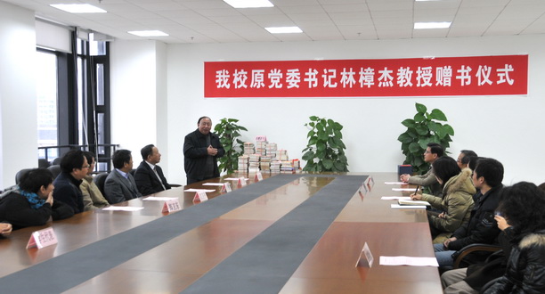 11月18日下午,我校原党委书记林樟杰教授向我校赠书仪式在图书馆举行。校党委书记叶骏教授、副校长程裕东教授、校办主任张敏教授、宣传部长江卫平、人事处长郑卫东、财务处长杨昕、图书馆全体领导以及部分师生代表出席了捐赠仪式。会议由图书馆张健馆长主持。
