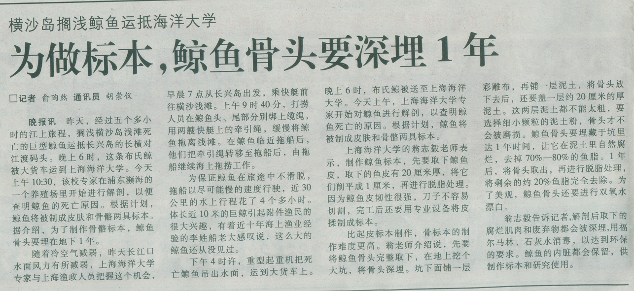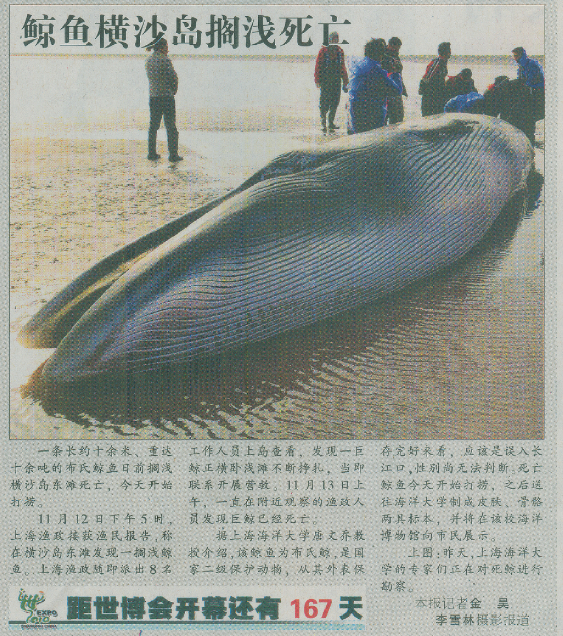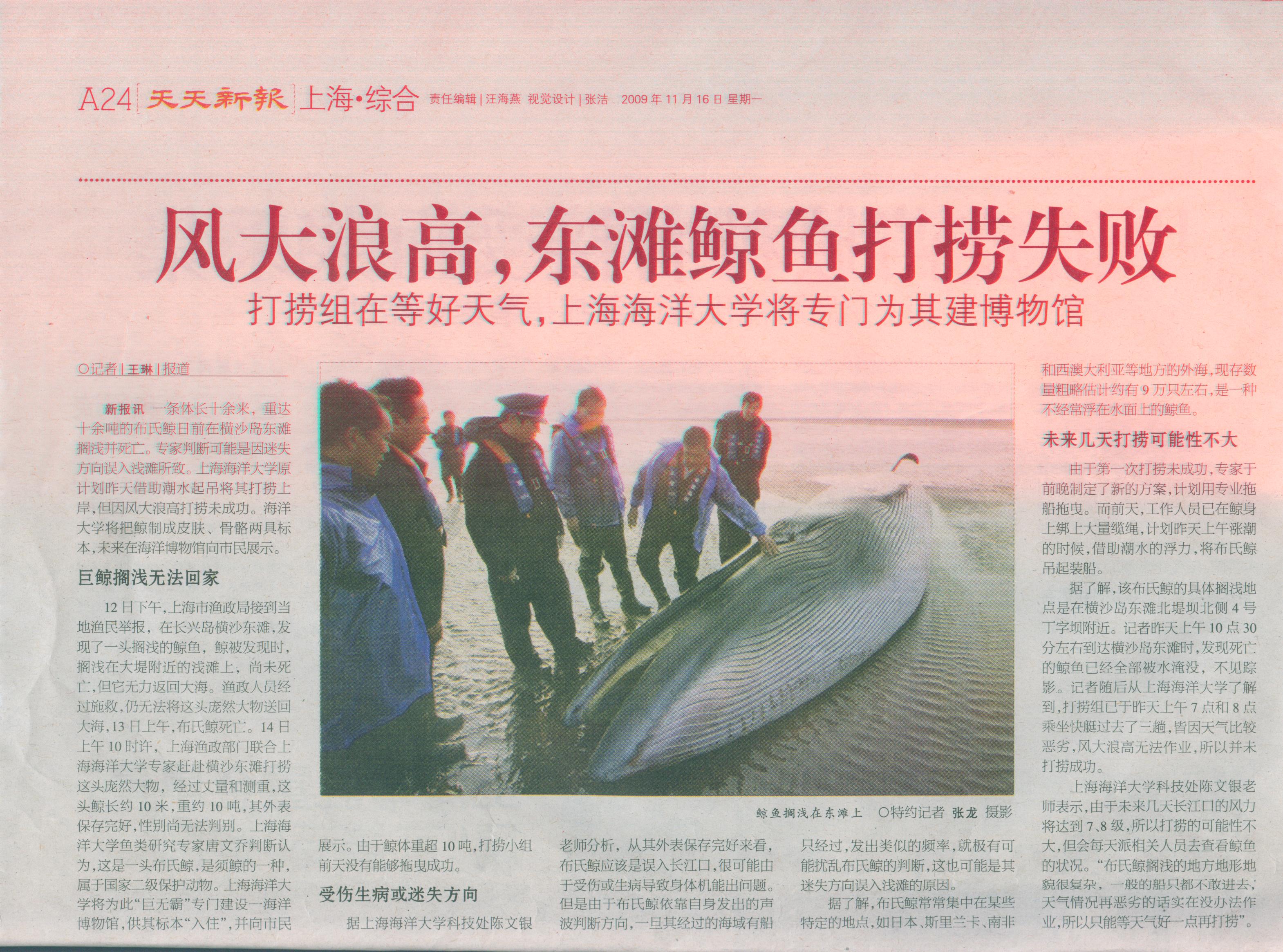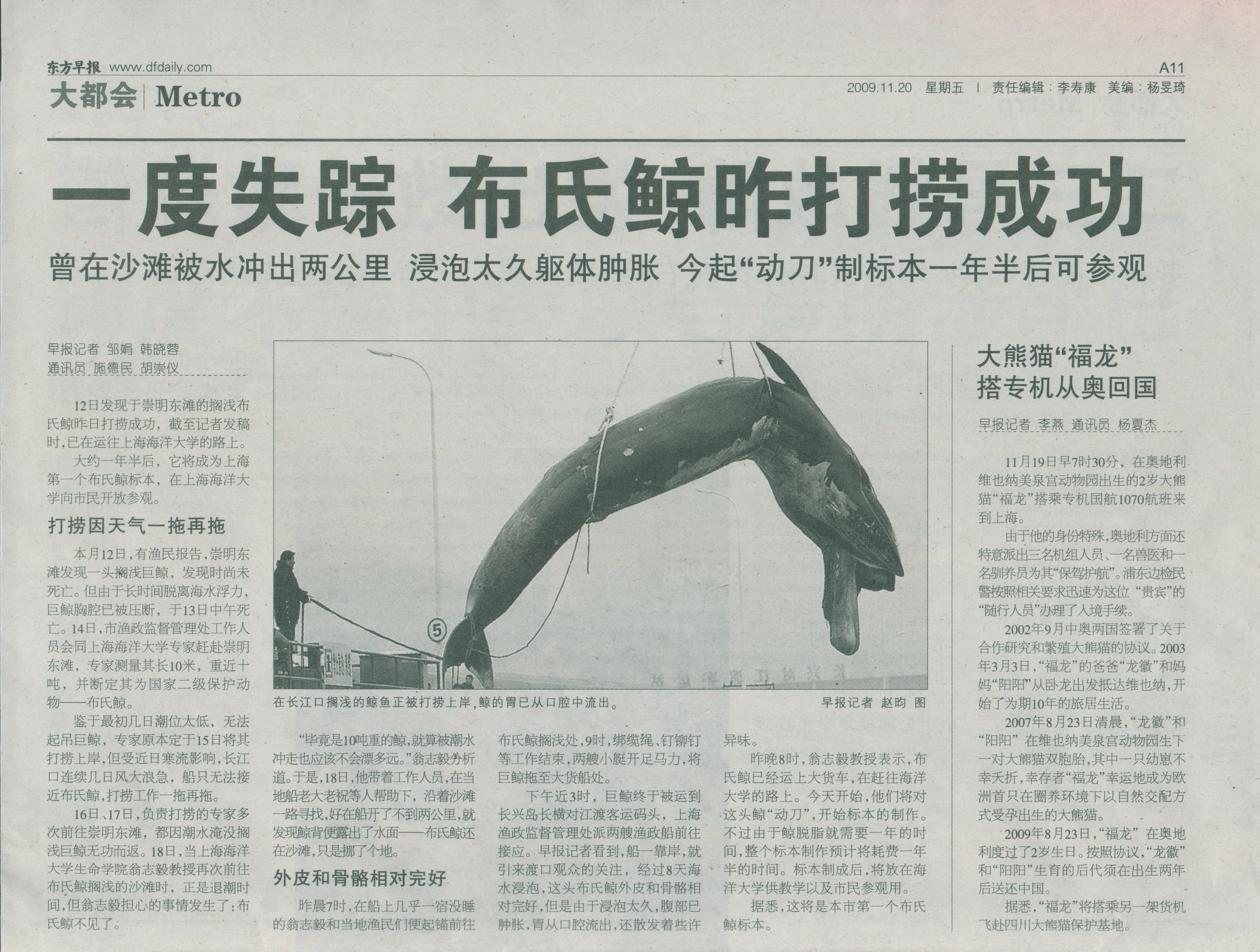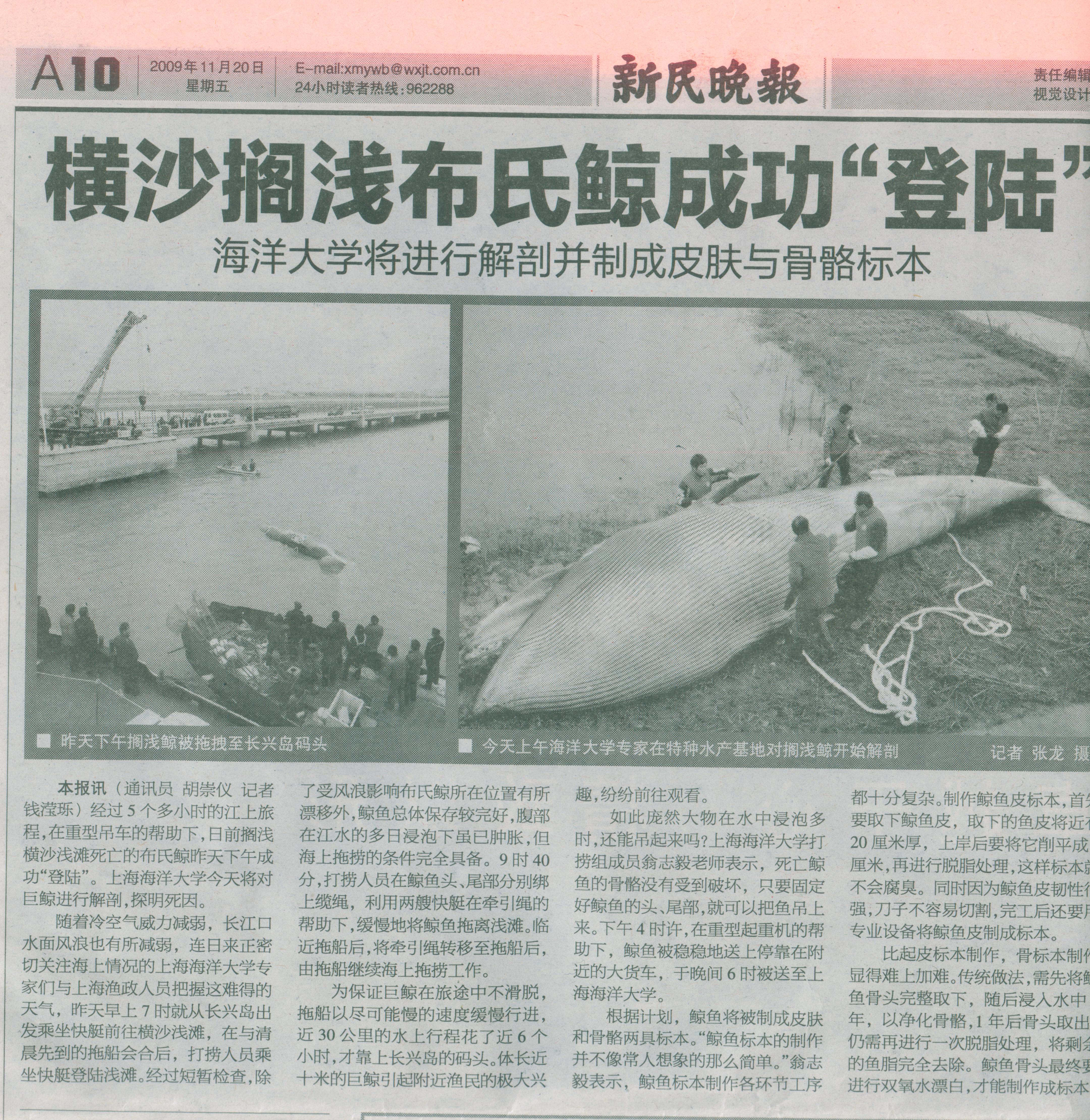 11月12日,崇明横沙东滩发现10余米长的搁浅布氏鲸,13日晚接获上海渔政局的通报,校领导高度重视,第一时间派出相关专家赶赴长兴岛协调打捞工作。由于连日海上大风,15日开始的打捞工作一度受阻。19日,随着冷空气离去,长江口水面风力也有所减弱,江面显得风平浪静,连日来正密切关注海上情况的我校水产与生命学院领导与专家把握这一良机,历经近7小时打捞,布氏鲸终于被打捞成功并送往我校位于滨海的特种水产养殖场安放。根据计划,死亡鲸鱼将被制成皮肤和骨骼两具标本。整个标本制作预计将耗费一年半的时间,标本制成后,将放在海洋大学供教学以及市民参观用。