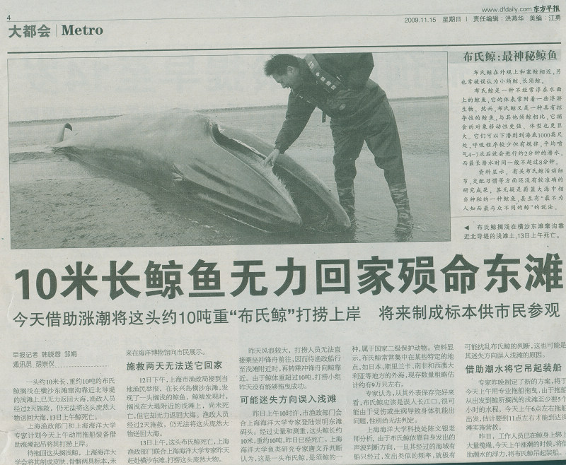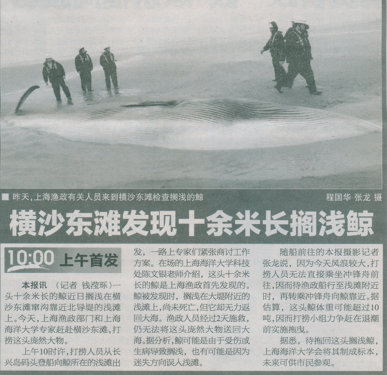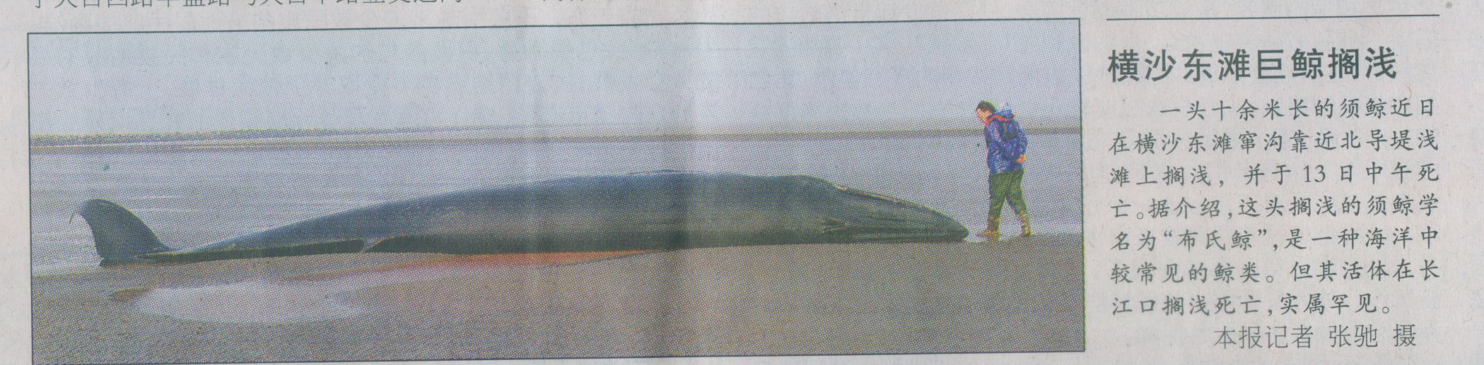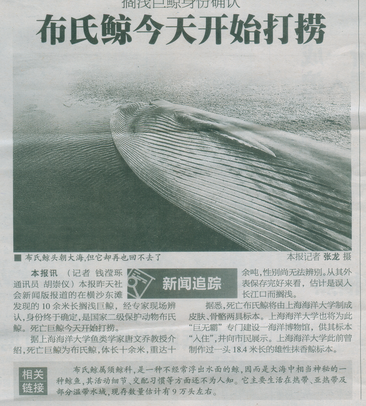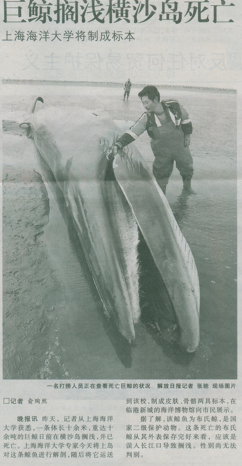 11月12日,崇明横沙东滩发现10余米长的搁浅布氏鲸,13日晚接获上海渔政局的通报,校领导高度重视,第一时间派出相关专家赶赴长兴岛协调打捞工作。由于连日海上大风,15日开始的打捞工作一度受阻。19日,随着冷空气离去,长江口水面风力也有所减弱,江面显得风平浪静,连日来正密切关注海上情况的我校水产与生命学院领导与专家把握这一良机,历经近7小时打捞,布氏鲸终于被打捞成功并送往我校位于滨海的特种水产养殖场安放。根据计划,死亡鲸鱼将被制成皮肤和骨骼两具标本。整个标本制作预计将耗费一年半的时间,标本制成后,将放在海洋大学供教学以及市民参观用。