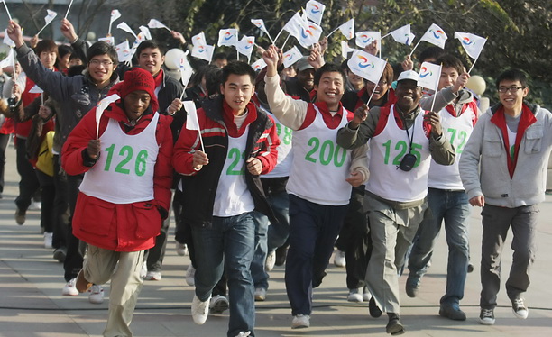 2010年1月1日9点半,随着一声发令枪响,在东方卫视等多家电视台的现场直播下,一百多名世博志愿者开始了激烈的比赛。最后,我校来自人文学院的杨海凤同学、海洋科学学院的朱晓雪同学分别获得女子组的第二名、第三名的好成绩。我校世博志愿者在登高跑中的积极表现和优异成绩,表现了海大学子积极向上、不畏困难、勇攀高峰的世博志愿者精神风貌。
